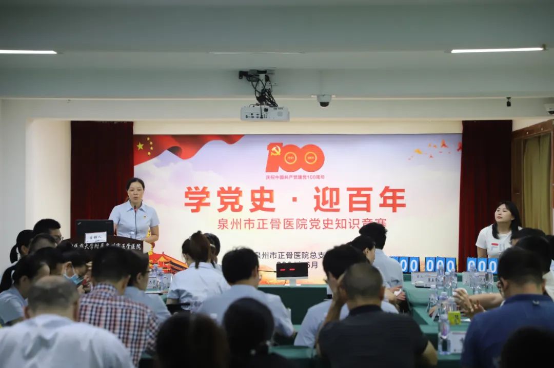 为庆祝中国共产党建党100周年,深入推进党史学习教育,引导广大党员群众一起学党史、知党情、跟党走。6月24日下午,泉州市正骨医院举办“学党史,迎百年”党史知识竞赛,7个支部分别组成了7支队伍共21名选手参加本次比赛。比赛由党总支宣传委员徐宝珍同志和第七党支部书记黄玲艳同志分别主持。 本次竞赛以党史学习教育为主要内容,设置了必答题、抢答题、风险题三个环节。