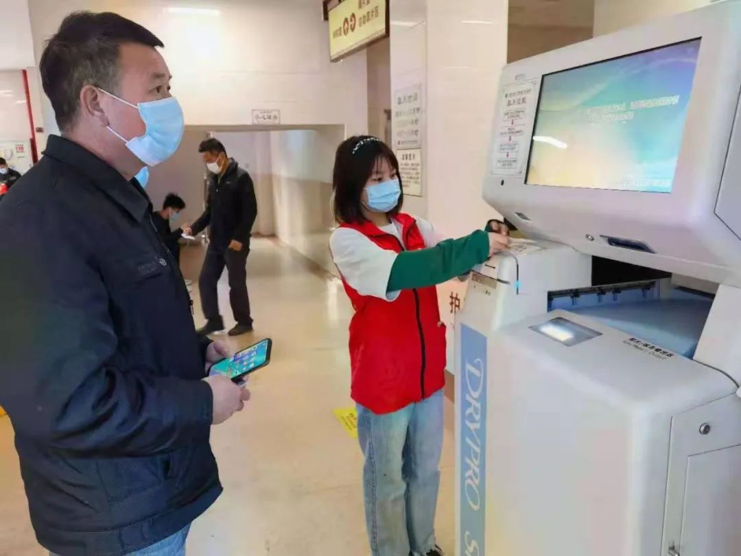 志愿者引导患者使用自助取片机
